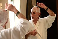 カミソリでの剃髪の方法、そしてツールの紹介をいただきました。